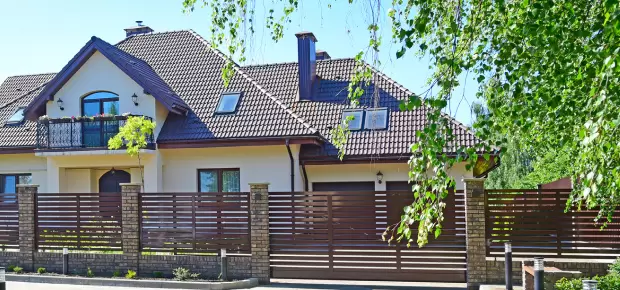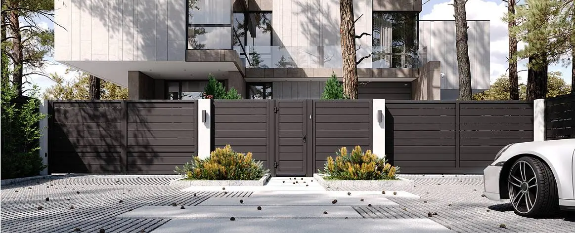 Выберите единый стиль оформления для распашных ворот, забора и калитки. А чтобы въездная группа сочеталась с вашим домом, закажите гаражные ворота идентичного дизайна.