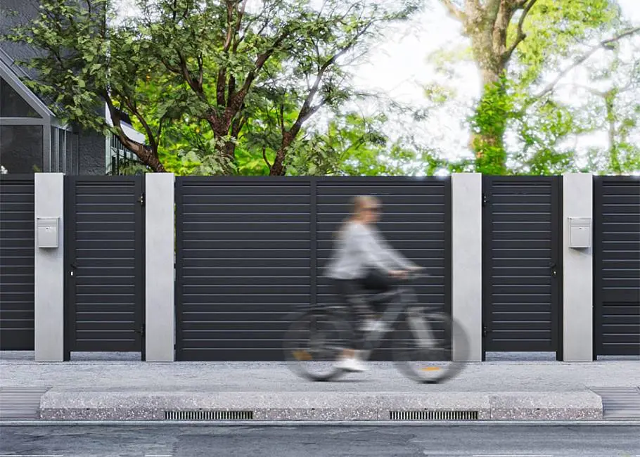 Жалюзи сохранят обзор улицы с участка, но при этом защитят участок от посторонних взглядов. Алюминиевые ламели (шириной 100 и 200 мм) располагаются горизонтально.